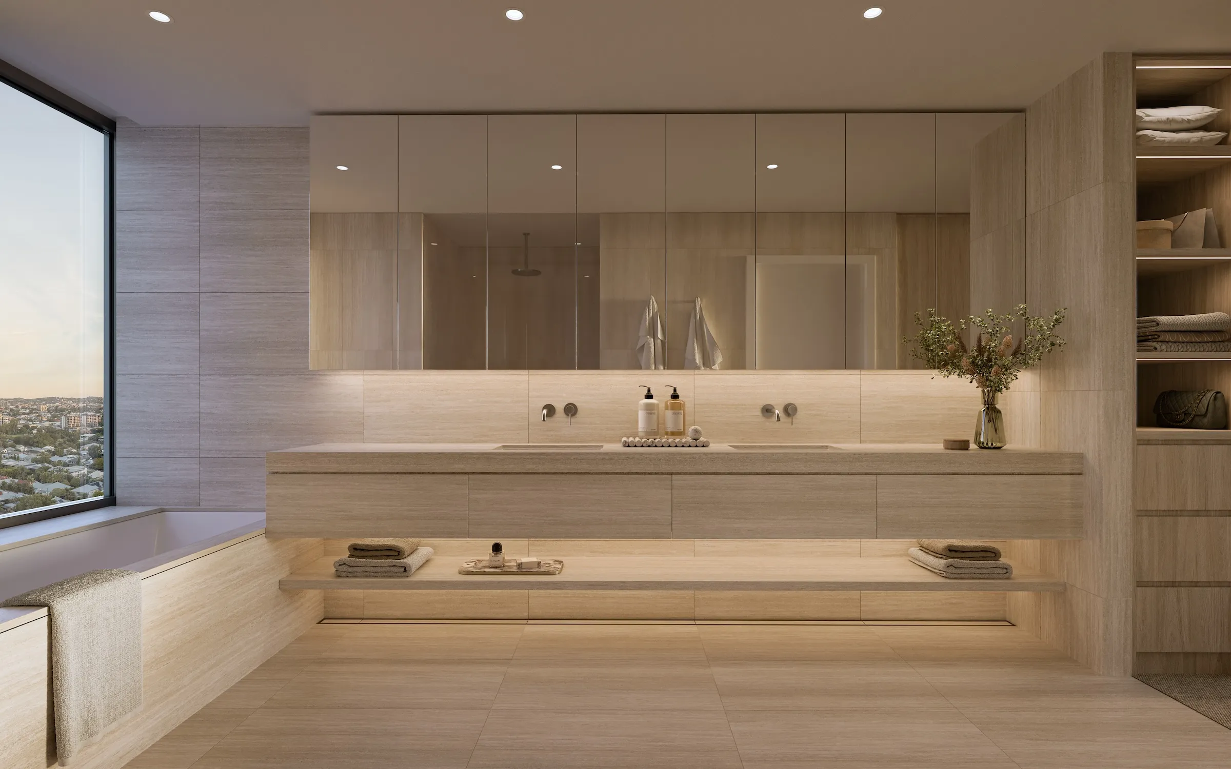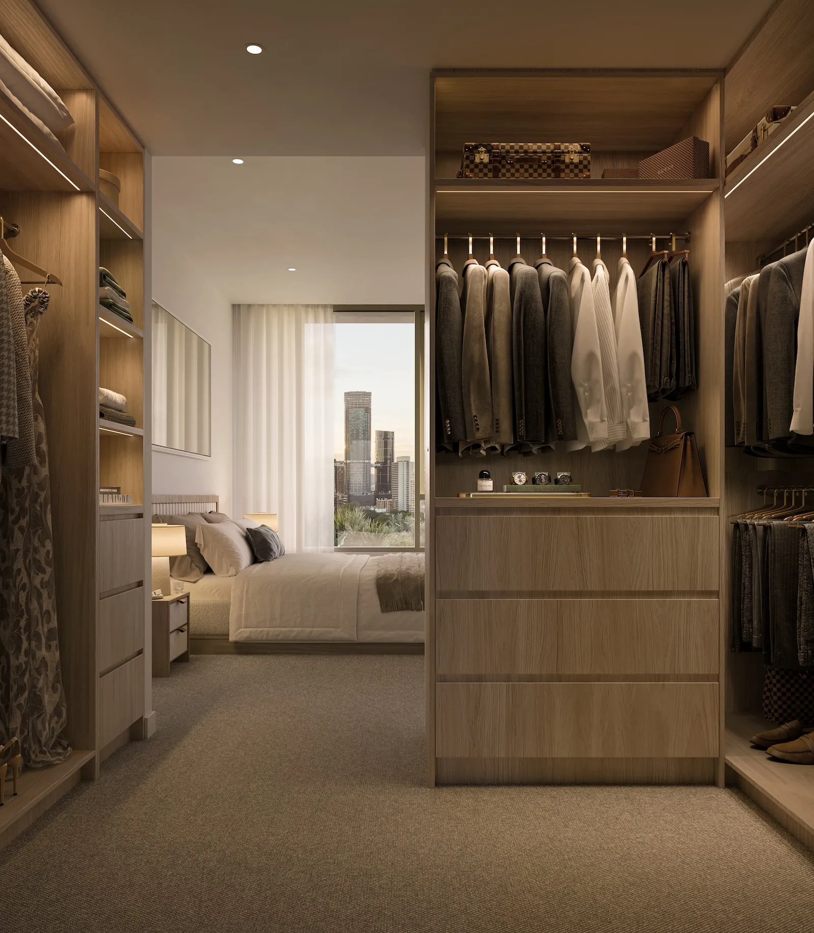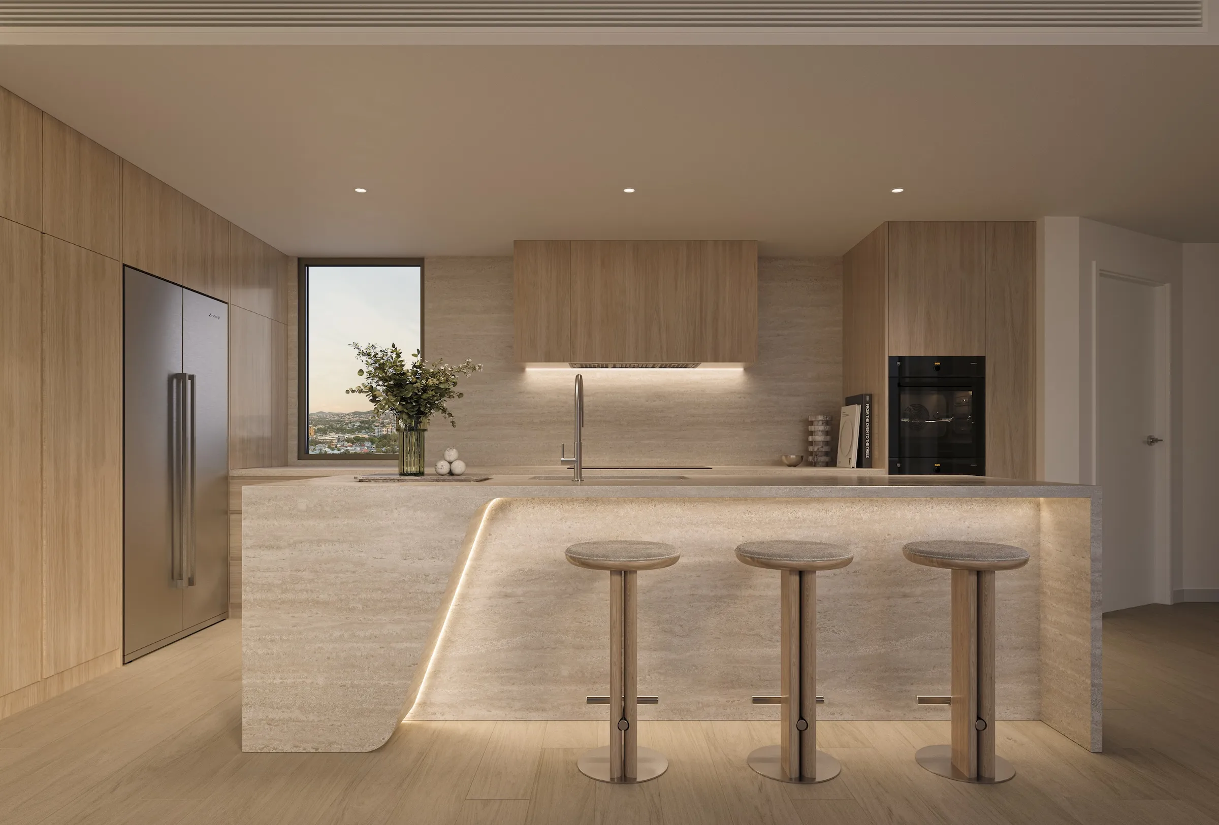 Interiors are warm and refined, with European oak flooring, stone finishes and bespoke joinery that evoke quiet sophistication. Open-plan spaces flow seamlessly to expansive balconies that invite outdoor dining and relaxation. Each home is an expression of understated luxury, where comfort and design meet in perfect balance.